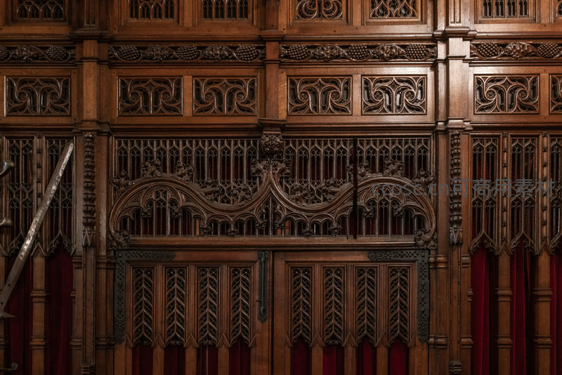 深棕色木质结构上布满哥特风格尖拱与卷草纹饰,红色帷幕点缀其间,光影交错中展现中世纪教堂或宫殿内部的肃穆与华美。