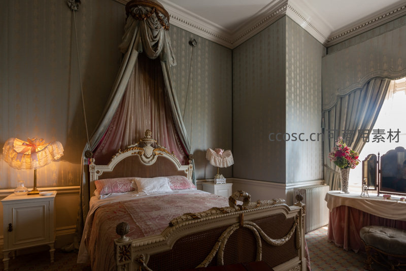 浅灰墙纸搭配粉白床品与轻盈纱幔,床头柜上的蝴蝶结台灯与窗边鲜花相映成趣,营造出温柔浪漫、如梦似幻的女性空间。
