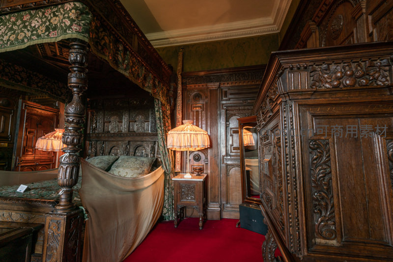 深色实木雕花四柱床搭配暖光台灯,红色地毯与绿色帷幔营造温暖氛围,展现19世纪贵族生活的精致细节。