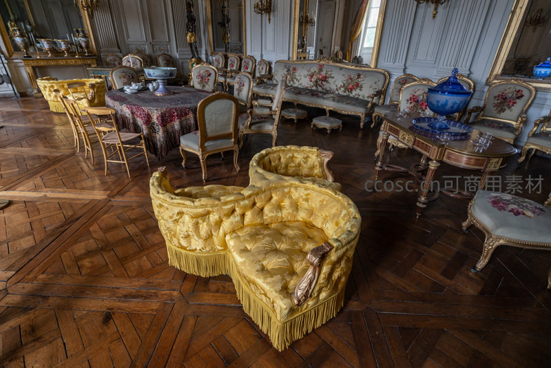 房间中央放置一张独特的心形金色丝绒沙发,周围环绕着雕花木椅与长桌,人字拼木地板与古典壁画交相辉映,散发浓郁的法式宫廷浪漫气息。