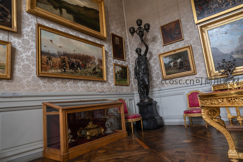 典雅的艺术展厅内,墙上挂满装裱精美的油画,中央矗立着黑色雕像,玻璃展柜内陈列珍品,红绒座椅与木质地板共同营造出庄重而高雅的文化氛围。
