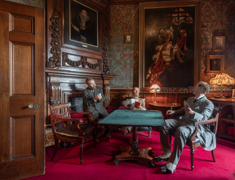 三位身着复古西装的绅士围坐在绿绒桌旁,于装饰华丽的古典房间内品茗闲谈。背景墙上挂有大幅油画与精致雕花壁炉,红色地毯与深色木饰营造出浓郁的历史氛围。
