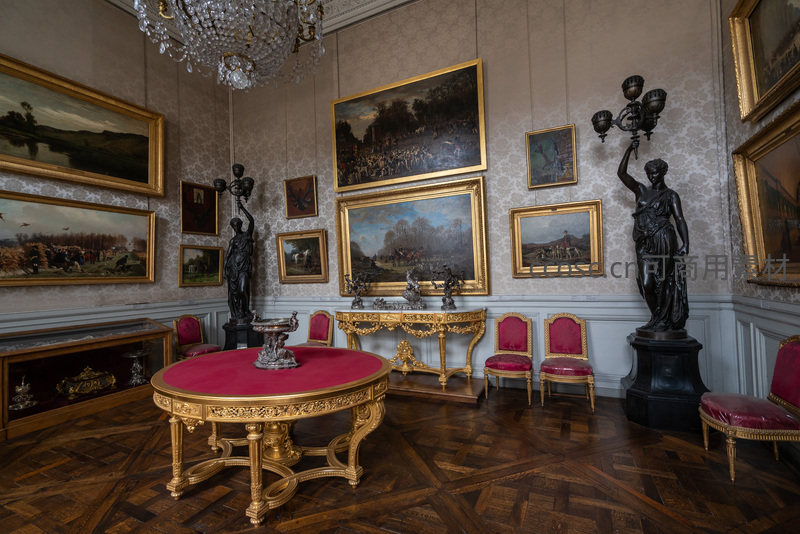 富丽堂皇的宫廷画廊,墙上挂满古典油画,中央摆放着镀金圆桌和红色丝绒座椅,水晶吊灯映照出历史的辉煌与艺术的沉淀。