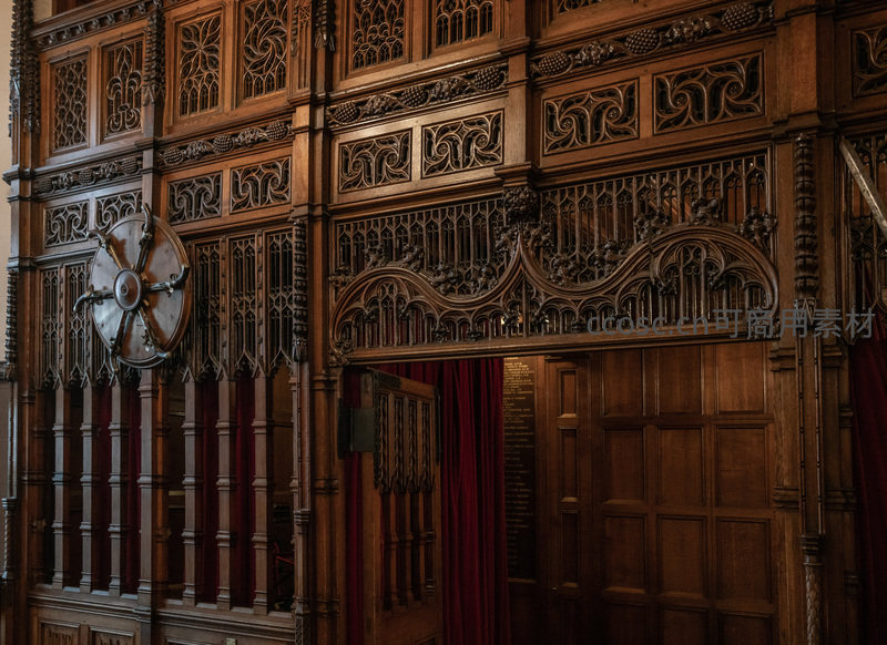 精美的哥特式风格木质墙面,布满繁复雕刻,搭配红色帷幕门廊,展现出中世纪建筑的庄严与艺术美感,极具历史厚重感。