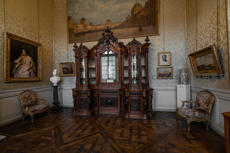 博物馆展厅内,一件华丽的古典木质橱柜居中陈列,周围环绕着油画与雕塑,人字拼木地板映衬出浓厚的艺术氛围与历史沉淀。