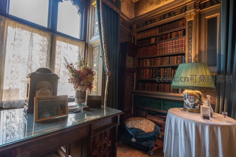 古典书桌旁陈列着政治文献与精致摆件