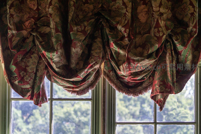 繁复花卉图案的窗帘在窗前优雅垂坠