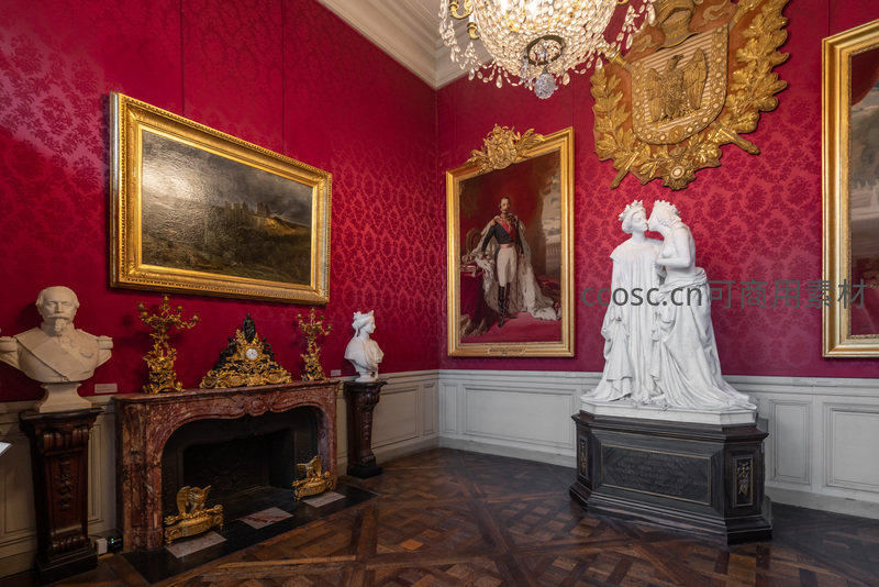 富丽堂皇的宫殿内室,红色花纹壁纸搭配金色画框与白色大理石雕塑,古典壁炉与水晶吊灯彰显贵族气派,尽显欧洲宫廷奢华风格。