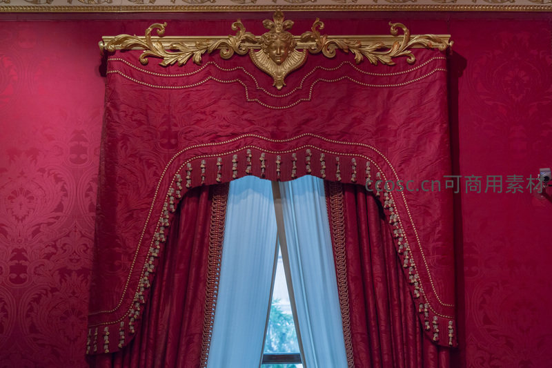 深红色丝绒窗帘配以繁复的金色雕花顶饰,营造出浓郁的欧式宫廷氛围,尽显高贵典雅与精致设计感。