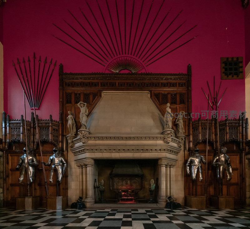 宽敞大厅内中央矗立着巨大石质壁炉,两侧陈列中世纪盔甲,背景为粉红色墙面与放射状装饰,气势恢宏。