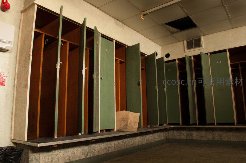 一排排绿色的更衣柜敞开着,里面空空如也,房间内光线昏暗,弥漫着被遗弃的气息,仿佛能听到昔日人声鼎沸的回响。