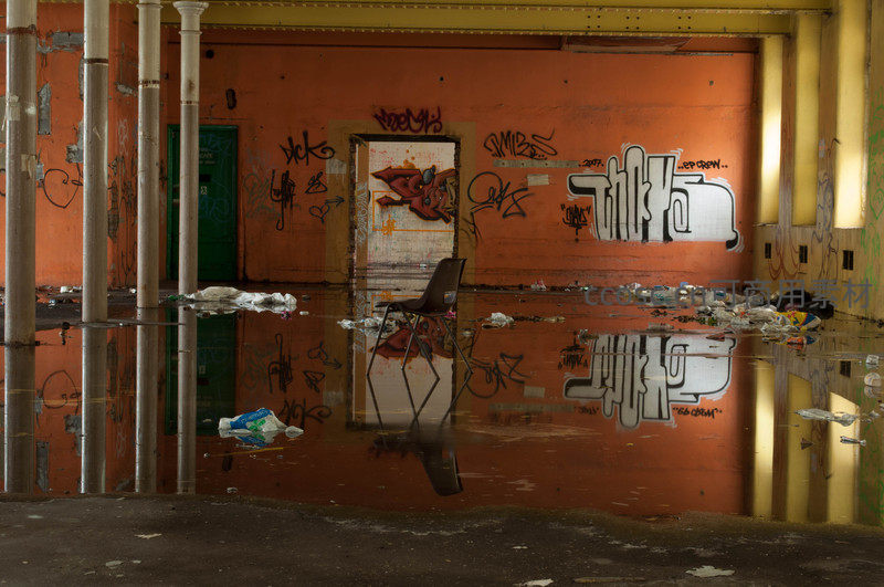 废弃工厂涂鸦墙与积水倒影