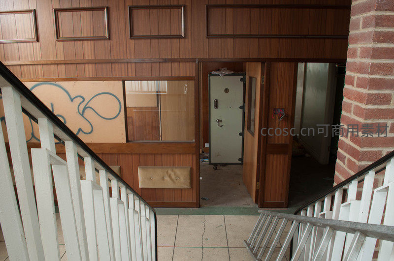 楼梯间通向破败的木墙房间