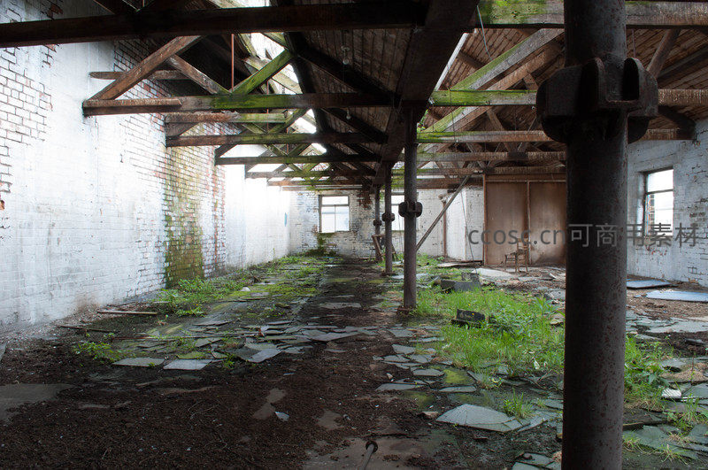 废弃厂房内部,杂草丛生的工业遗迹