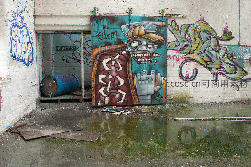 角落里一幅巨大的卡通风格涂鸦栩栩如生,旁边躺着一个蓝色废弃油桶,地面积水倒映着画作,形成现实与想象交织的独特场景。