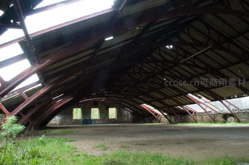 高大的拱形钢结构屋顶下,阳光透过天窗洒在布满尘土的地面上,墙壁斑驳,远处几扇窗户透进微光,四周杂草丛生,尽显荒凉之美。