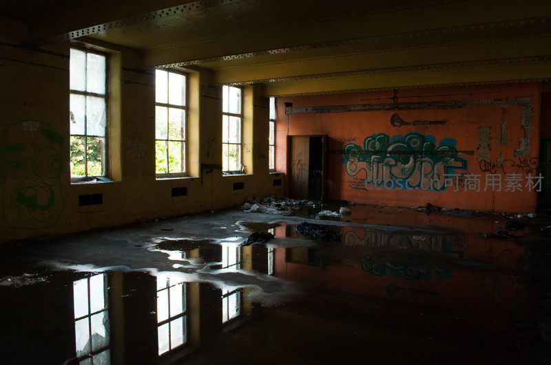 废弃室内空间中,彩色涂鸦覆盖墙面,自然光从高窗倾泻而下,与地面积水形成的倒影交相辉映,强化了空间的纵深感与时间停滞感。