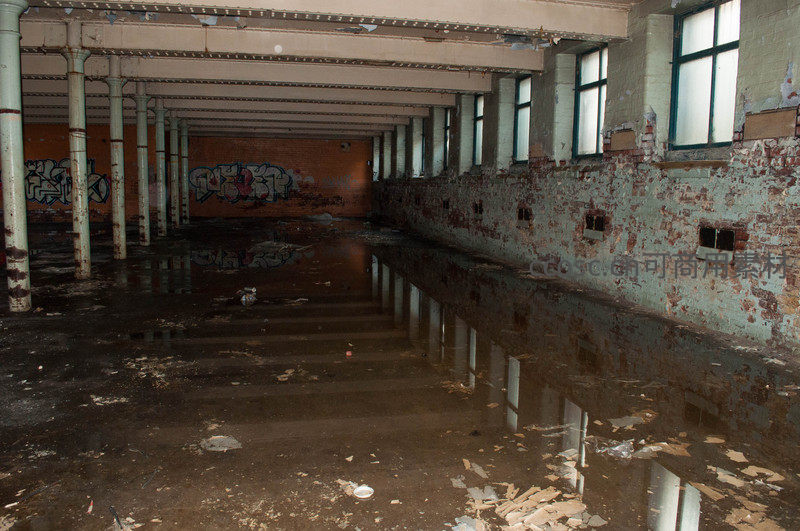 一条长长的废弃厂房走廊,一侧墙壁上留有彩色涂鸦,另一侧是剥落的砖墙。地面积水倒映着立柱和窗户,形成深邃的空间透视,充满探索氛围。