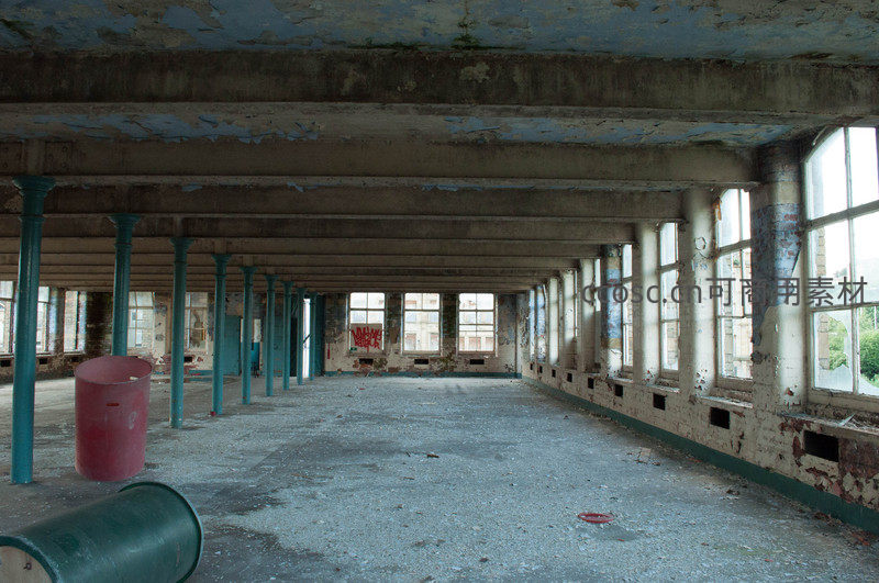 这间废弃的车间内部空无一人,灰色的混凝土地面上散落着几个红色和绿色的塑料桶。墙壁和立柱上布满涂鸦和剥落的油漆,窗外绿树成荫。