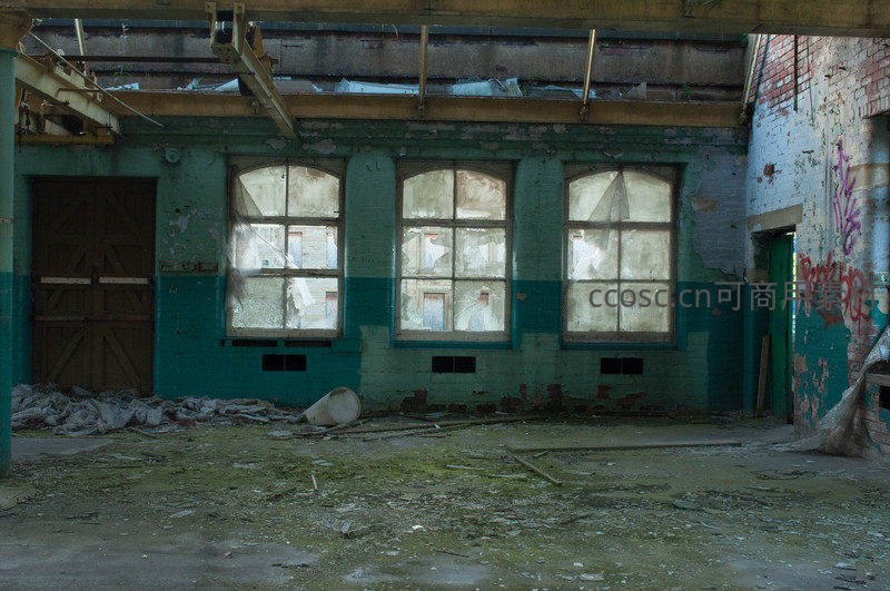 这是一张废弃工厂内部的照片,墙壁斑驳,窗户破损,地面散落杂物,充满荒凉与衰败感,展现了工业遗迹的沧桑历史。