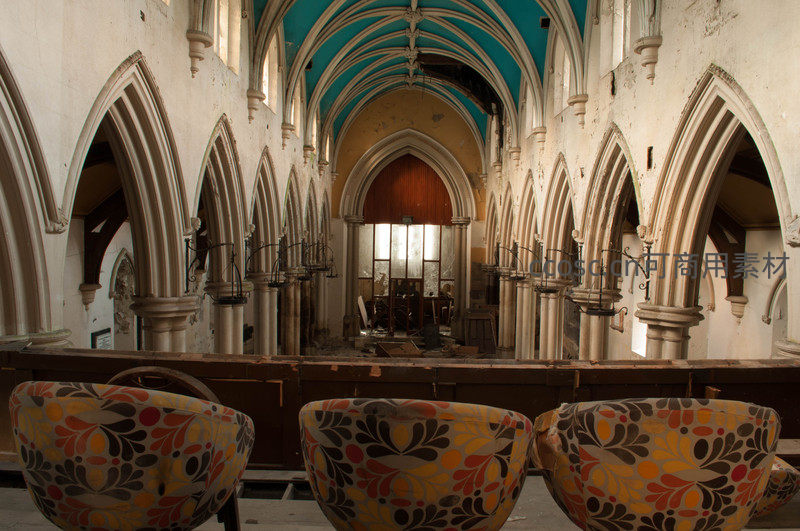 彩色座椅前眺望废弃教堂的纵深空间