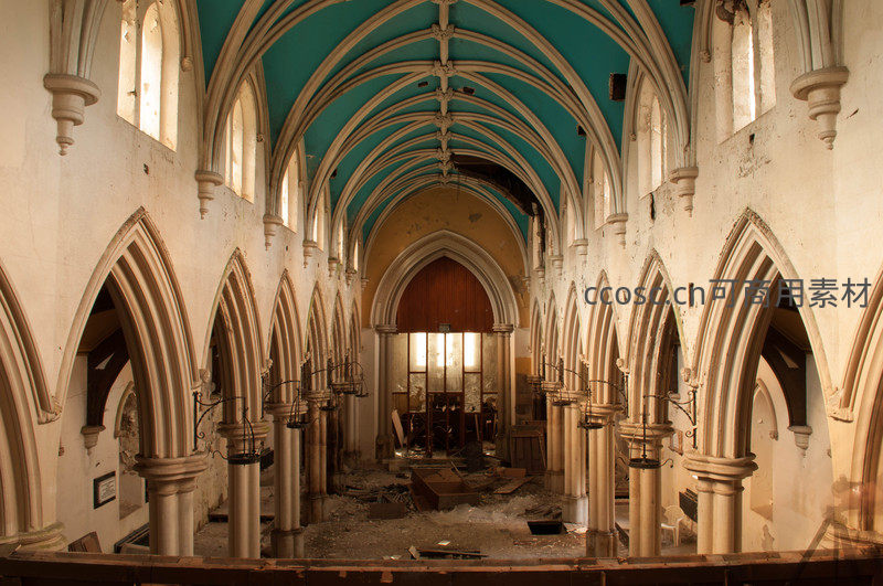 从高处俯瞰废弃教堂满地狼藉的场景