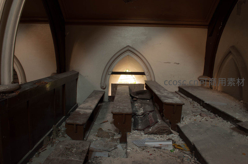 一座废弃教堂的内部景象,长椅倾倒,地面满是碎屑和灰尘,拱形窗户透入微弱光线,营造出荒凉而庄严的氛围。