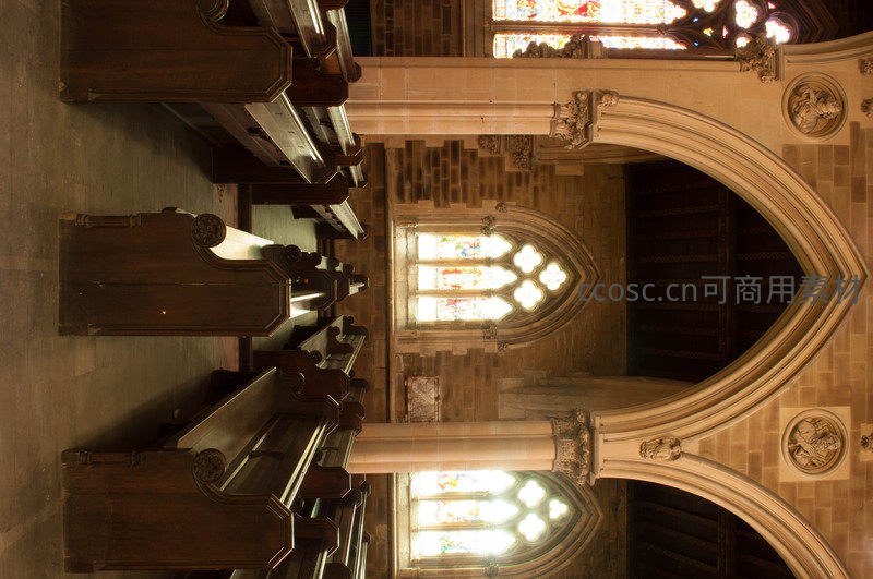 教堂木制长椅与彩色玻璃窗的对称构图