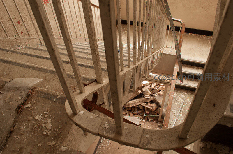 一座被遗弃的建筑内,螺旋楼梯锈迹斑斑,台阶上散落着大量砖块和建筑垃圾,整个空间弥漫着荒凉与衰败的气息。