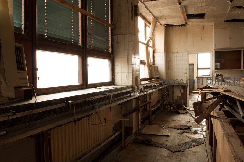 空无一人的废弃厨房里,阳光透过百叶窗斜射进来,照亮了布满灰尘的台面和破损的橱柜,营造出一种静谧而沧桑的氛围。