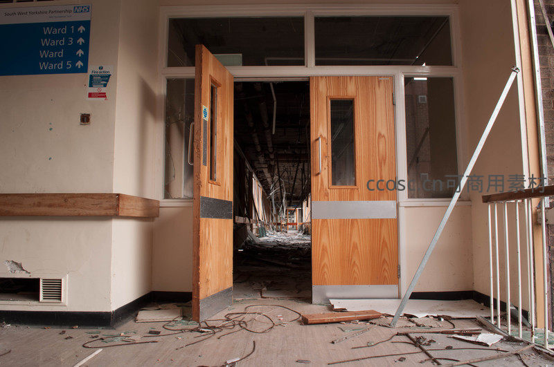 一扇半开的木质门通向更深处的废弃区域,门旁墙上的指示牌显示Ward 1至5的方向,门内黑暗走廊布满杂物,令人不禁想象这里曾有的喧嚣与如今的死寂。