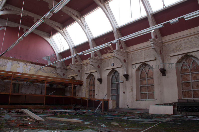 空旷废弃礼堂,拱形窗与斑驳天花板的静默诉说