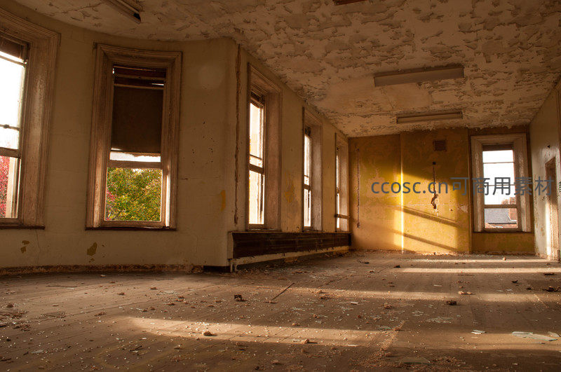 温暖的阳光穿过几扇破旧的窗户,在布满灰尘的地板上投下长长的光带。墙壁油漆剥落,露出底层,整个空间在光影交错中,展现出一种衰败却宁静的独特美感。