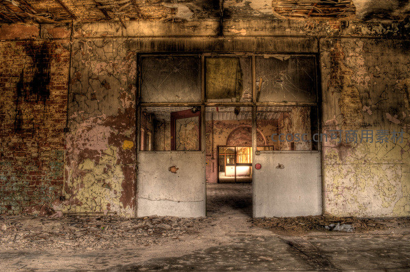 一扇破旧的双开门敞开着,门后是更深的废墟,远处一扇窗户透出温暖的夕阳余晖,为这片衰败之地增添了一丝希望与诗意。
