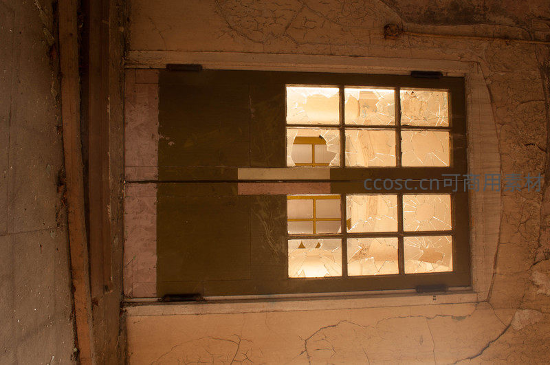 一扇布满裂痕的窗户透出温暖的光线,照亮了斑驳脱落的墙壁,营造出一种时光流逝、物是人非的静谧与苍凉感。