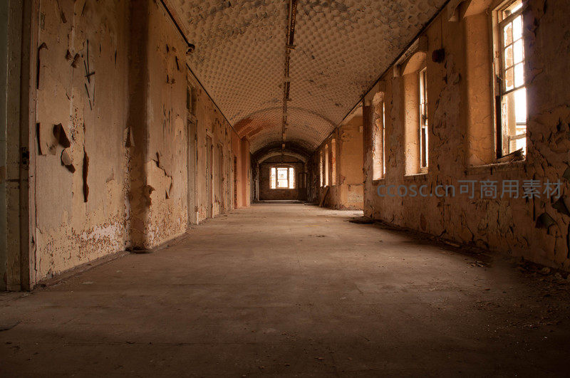 漫长走廊尽头透进微光的废弃医院长廊