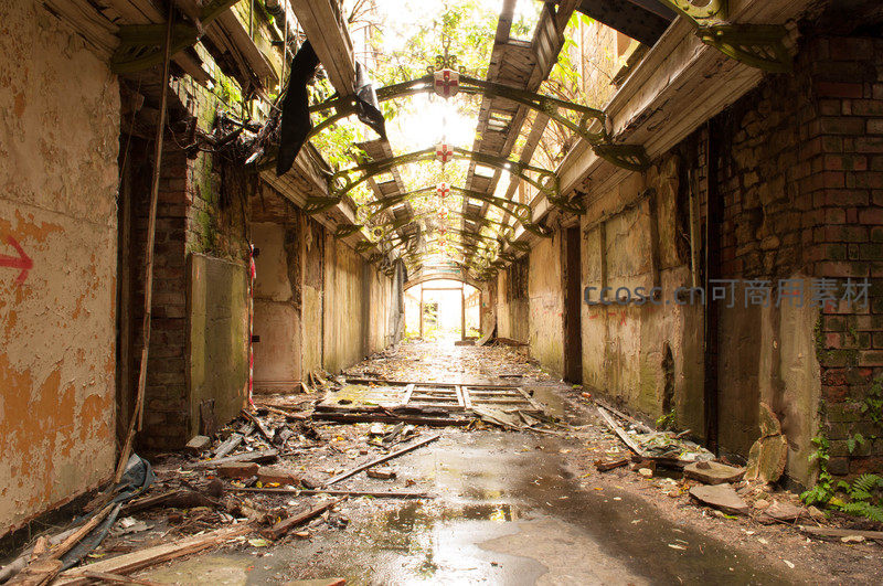 阳光从破损的屋顶倾泻而下,照亮了布满碎石与落叶的废弃走廊,营造出一种既荒凉又充满诗意的末日美学氛围。