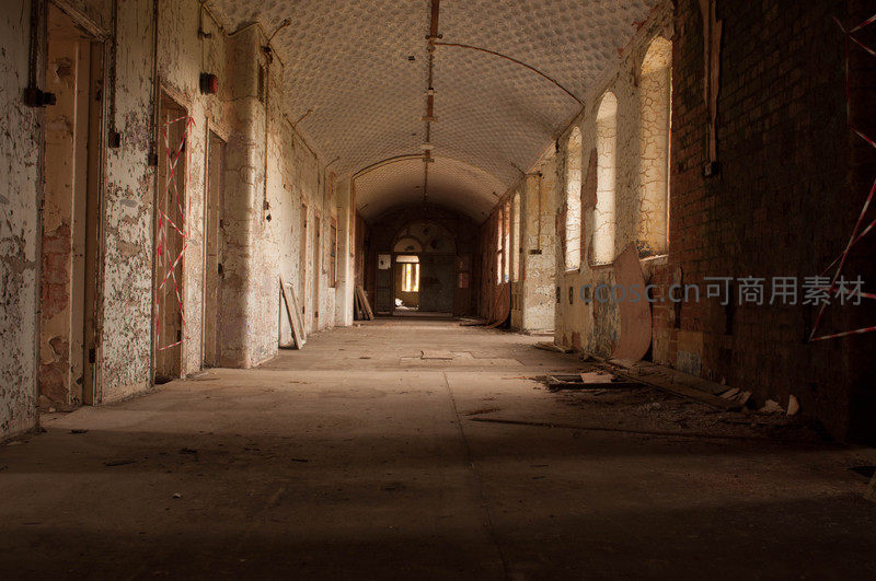 一条漫长而破败的走廊,两侧是斑驳的墙壁和紧闭的房门。尽头处透出的光线为这幽深的空间带来一丝希望,也更添神秘感。