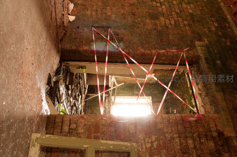 从低角度仰望,一扇破损的窗户被红白相间的警戒线交叉封锁,阳光穿透缝隙洒下。古老的砖墙与现代警示标志形成强烈对比。