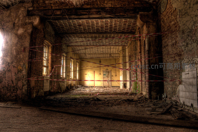 警戒线交织的废弃大厅