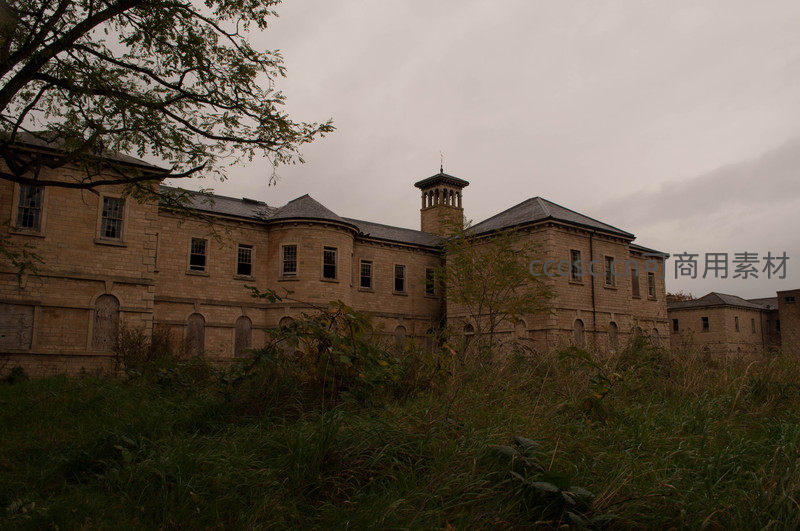 在灰暗天空的笼罩下,一组废弃的砖石建筑静静伫立,墙体风化,窗洞空寂,前景的野草和树枝更添荒凉与历史沧桑感。