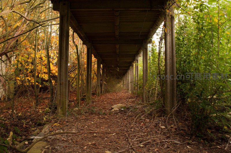 一条被森林包围的废弃木制长廊,地面覆盖着厚厚的落叶和枯枝,两侧绿植疯长,阳光透过树叶缝隙洒下,充满野性与宁静之美。