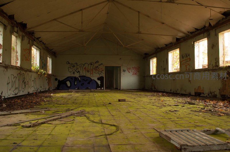 废弃厂房内部,涂鸦与青苔覆盖的荒凉空间