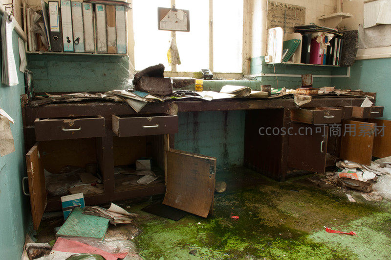 破败办公桌,抽屉敞开,绿苔蔓延地面
