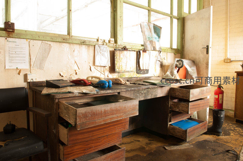 废弃工厂的旧工作台与工具