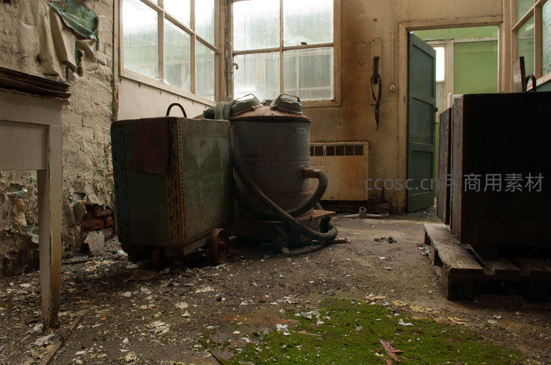空旷的废弃厂房内,地面上长满了绿色青苔,一台老旧的工业吸尘器静置一旁,四周墙壁剥落,门窗残破,整个空间弥漫着寂静与衰败的气息。