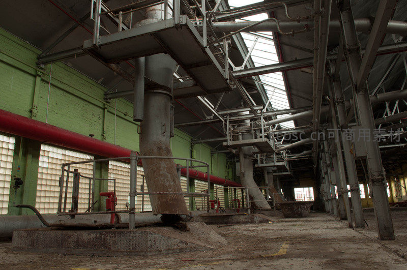 废弃工厂内部,粗大的金属管道和支架纵横交错,墙面斑驳,地面布满灰尘与杂物,展现出工业衰败后的静谧与沧桑感。