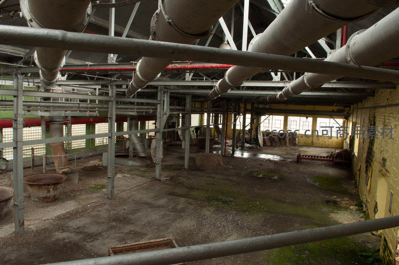 空旷厂房中交错的管道与支撑柱