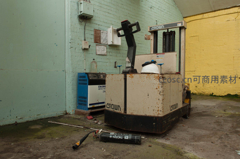 一台标有Crown字样的旧式叉车停在墙角,旁边是蓝色空压机和倒地的气瓶,墙面剥落,地面湿滑,记录着被遗忘的工业角落。