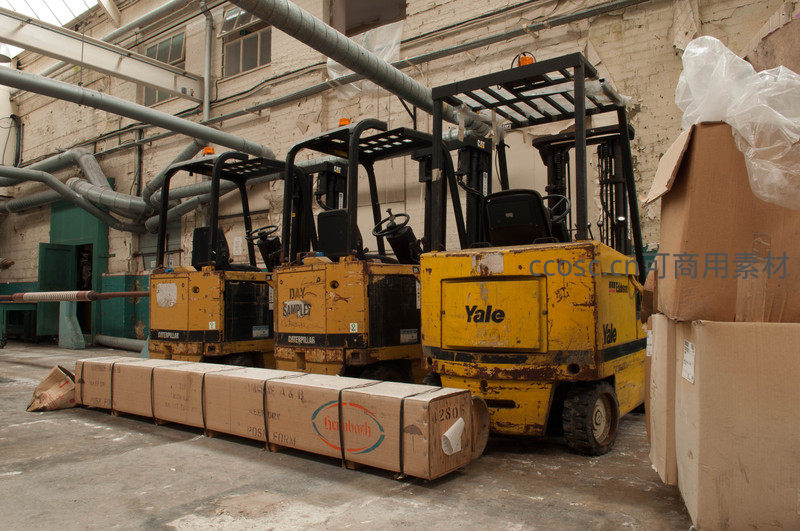 仓库内黄色叉车与纸箱堆